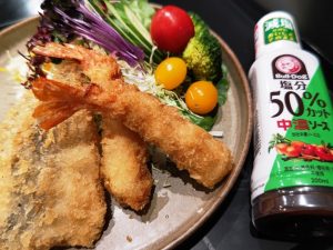 この日も揚げたてのアジフライに「塩分50%カット中濃ソース」をかけていただいたのでございました。